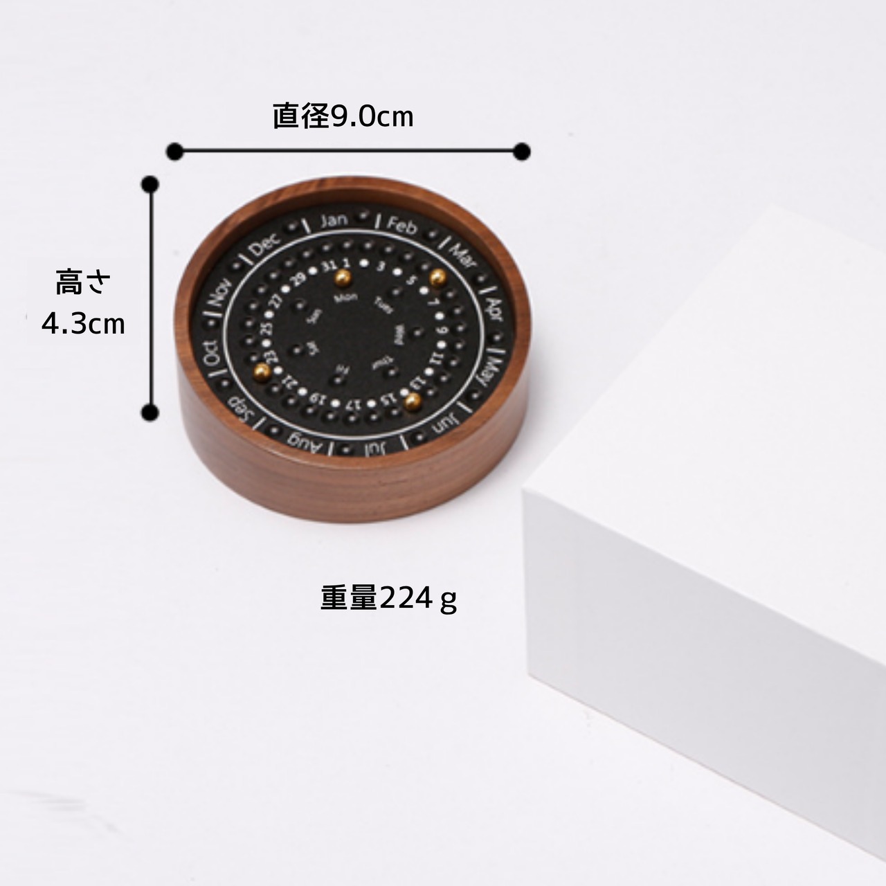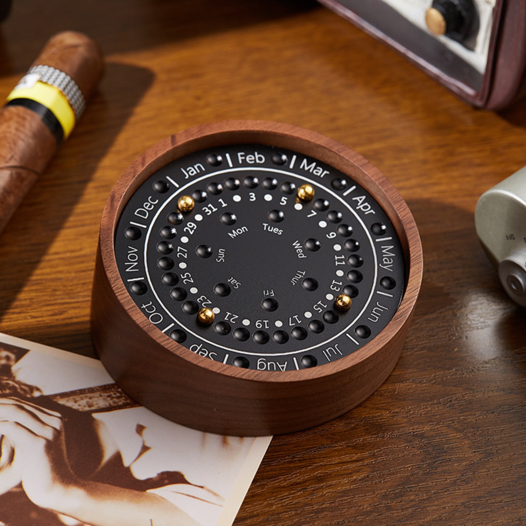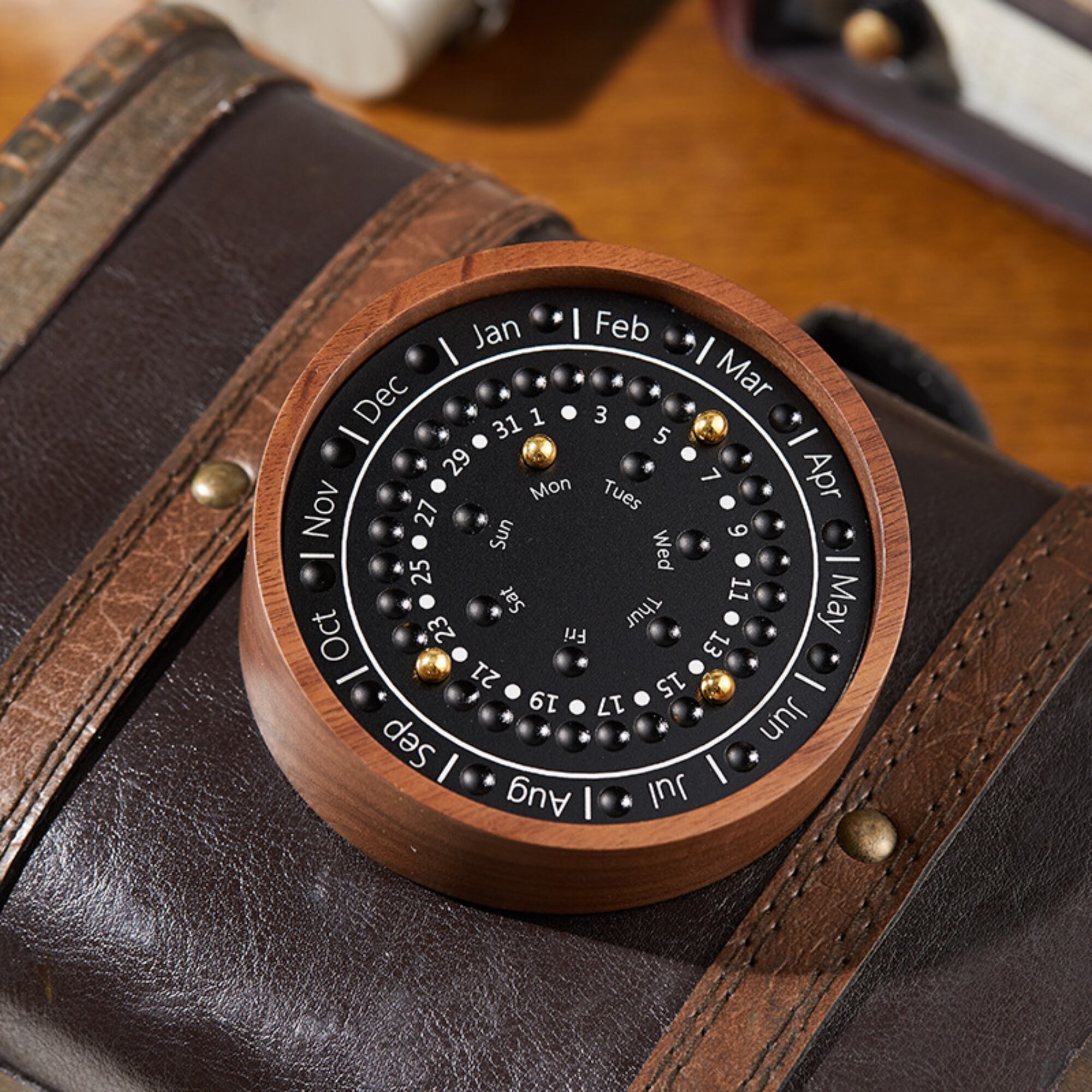 サークルタイプの胡桃材ベースのパーペチュアルカレンダー(万年カレンダー)です。