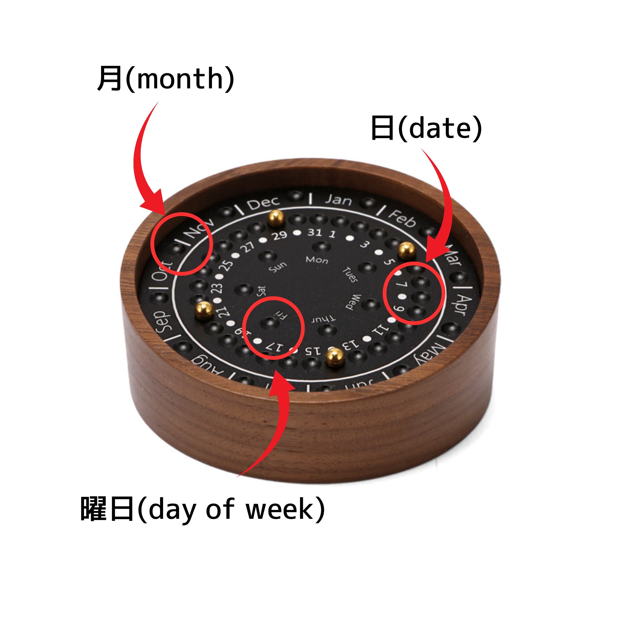 円状に配置された月(month)-日付(date)-曜日(day of week)のくぼみにゴールドのボールを置いて月日を表示させます。